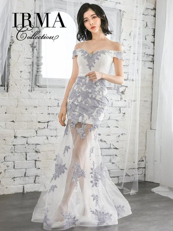 気品に満ちた女性へ導くキャバドレス♪ 【IRMA/イルマ】チュールスカート刺繍 オフショルダー タイトロングドレス[アイボリー×ダブグレー]