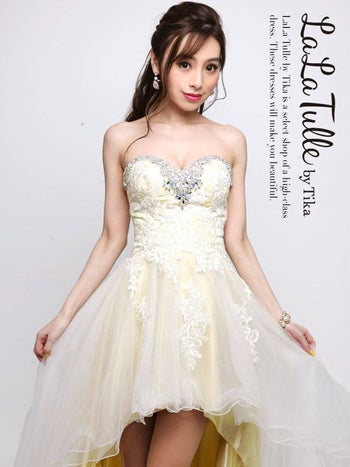 爽やかな雰囲気のグラデーションカラーと裏地がレモンイエローのオシャレなロングテールドレスが2パターン♪