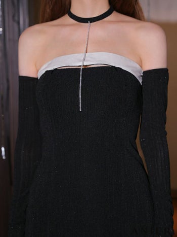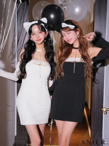 5. 【ANIER./アニエル】長袖 ベアトップ セクシー ラメ モノトーン 猫 タイトミニドレス [ドレス/チョーカー/カチューシャ/アームウォーマー](anier4052)
