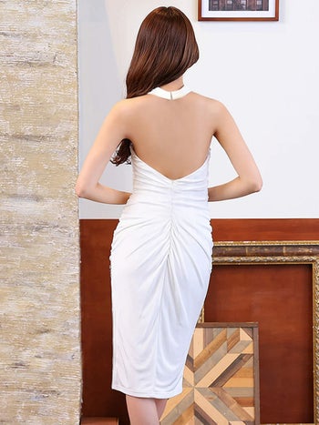 4. 【Veautt/ヴュート】ギャザー チェーン ホルターネック クロスデザイン ジップデザイン スリット 膝丈ドレス (VT022504)