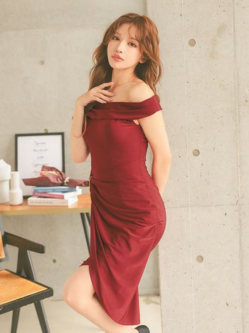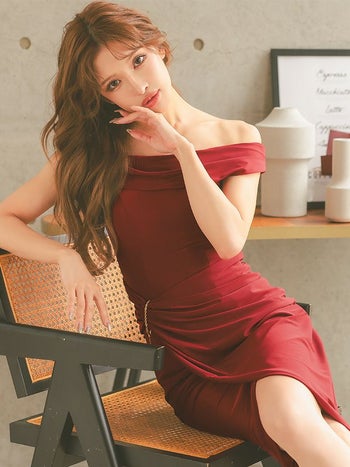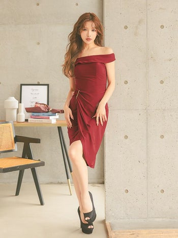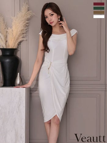 キャバドレス Veautt ヴュート 2way ウエストチャーム オフショルダー ワンカラー ラップ風 膝丈ドレス