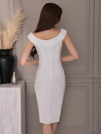 4. 【Veautt/ヴュート】2way ウエストチャーム オフショルダー ワンカラー ラップ風 膝丈ドレス (VT022518)