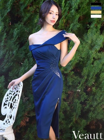 キャバドレス Veautt ヴュート ジップデザイン スリット タック ビジュー ワンショルダー 膝丈ドレス