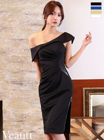 キャバドレス Veautt ヴュート ワンショルダー ジップデザイン スリット タック ビジュー 膝丈ドレス