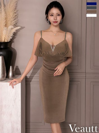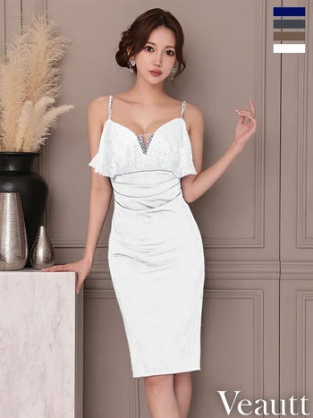 キャバドレス Veautt ヴュート キャミソール Vカット フリル ウエストタック ビジュー メッシュ 膝丈ドレス