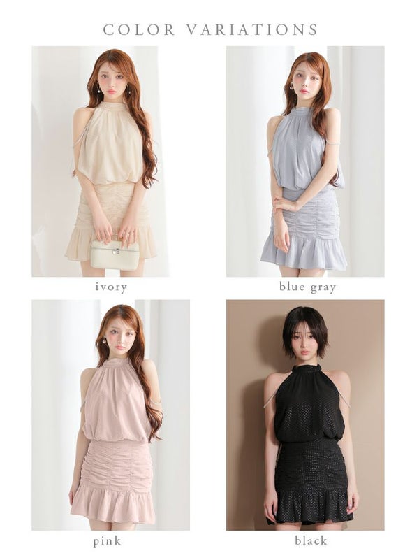 首元はホルターネックで詰まっているのでアップスタイルの髪型にして、肩ラインを見せるのがおすすめです♪