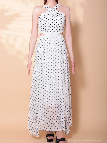 4. 【Andy/アンディ】シフォン カットアウト ドット柄 ホルターネック Aラインロングドレス(anon2946)