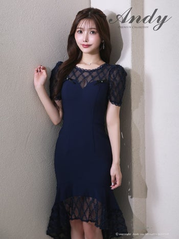 キャバドレス Andy 半袖 チェック柄 ドット柄 シースルー レース リボン ロングテールドレス