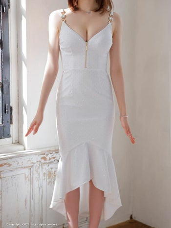 キャバドレス an ガーリー ジップデザイン キャミソール 裾フリル フラワー チャーム ドット柄 ロングテールドレス