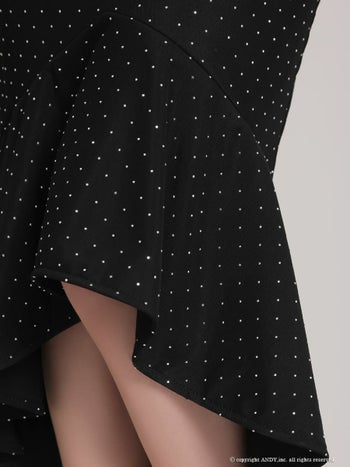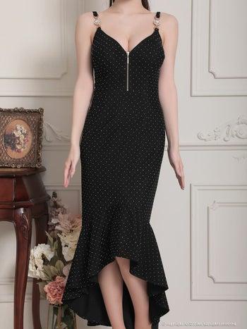 キャバドレス an ガーリー ジップデザイン 裾フリル キャミソール フラワー チャーム ドット柄 ロングテールドレス