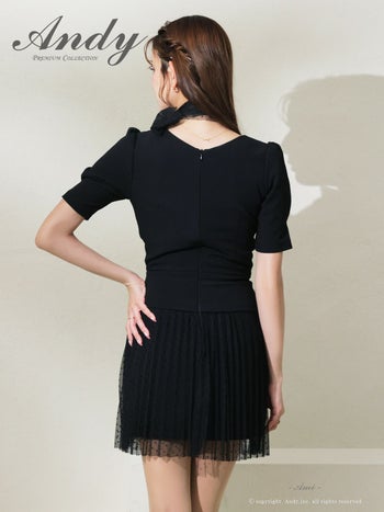 4. 【Andy/アンディ】ドット柄 半袖 ネック リボン チュール ビジュー ボタン スクエアネック フレアミニドレス (anok2997)