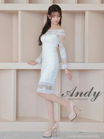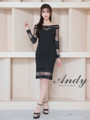 キャバドレス ミディアムドレス Andy アンディ ドット柄 ワンカラー 花柄 シアー オフショルダー 長袖 膝丈ドレス
