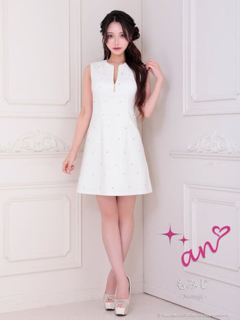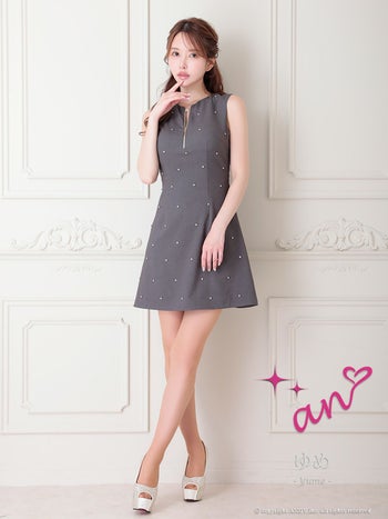 キャバドレス an ノースリーブ ジップデザイン ビジュー ドット柄 バックカット フレアミニドレス