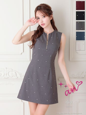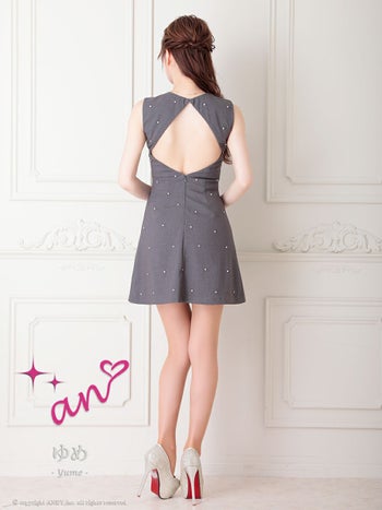 キャバドレス an ジップデザイン バックカット ノースリーブ ビジュー ドット柄 フレアミニドレス