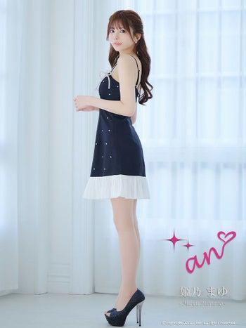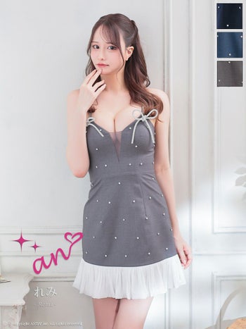 キャバドレス an アン バイカラー ビジュー キャミソール ドット柄 裾フリル リボン バストシースルー フレアミニドレス