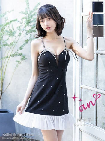 3. 【an/アン】ドット柄 バイカラー ビジュー キャミソール 裾フリル リボン バストシースルー フレアミニドレス(aoc3864)