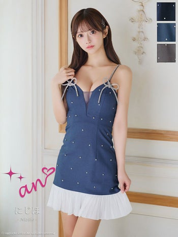 キャバドレス an アン ドット柄 バイカラー ビジュー キャミソール 裾フリル リボン バストシースルー フレアミニドレス