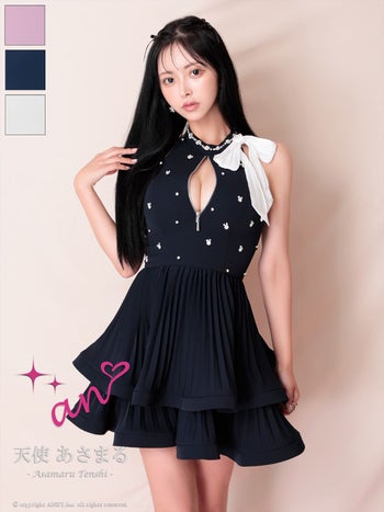 キャバドレス an ホルターネック ジップデザイン ビジュー ドット柄 ネックリボン ティアード フリル フレアミニドレス
