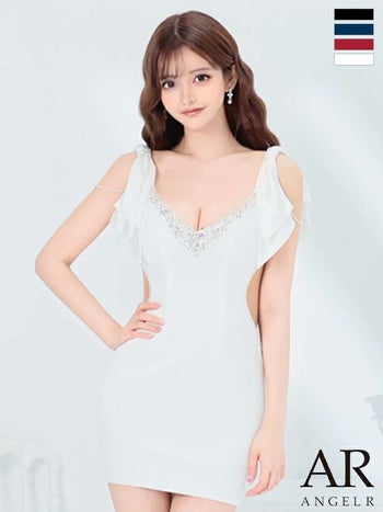キャバドレス Angel R くびれ透け ビジュー Vカット リボンショルダー ドット柄 ノースリーブ タイトミニドレス