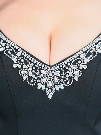XSあり!キラキラビジューが華やかにデコルテに♪ 【Angel R/エンジェルアール】くびれ透け ビジュー Vカット リボンショルダー ドット柄 ノースリーブ タイトミニドレス (AR24251)