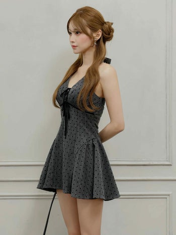 4. 【Angel R/エンジェルアール】ドット柄 バストリボン Vカット ホルターネック ガーリー フレアミニドレス (AR25850)