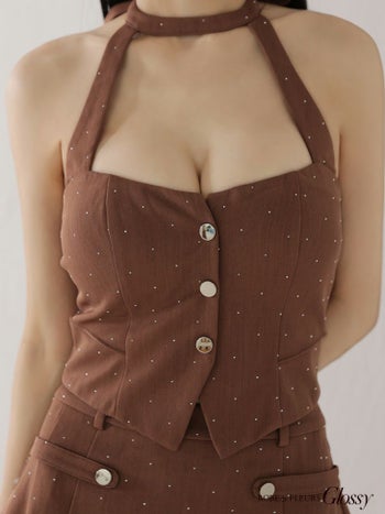 XSあり!キラリと光るストーンデザイン♪ 【Glossy by ROBE de FLEURS/グロッシー】ホルターネック ストーン付き セットアップ セクシー ドット柄 フレアミニドレス (GL4117)