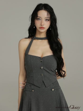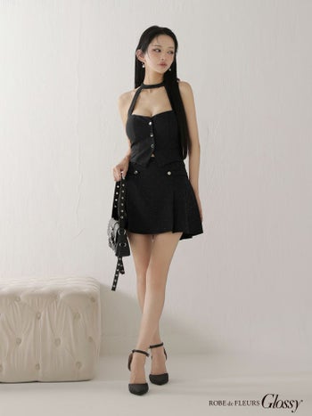 4. 【Glossy by ROBE de FLEURS/グロッシー】ホルターネック ストーン付き セットアップ セクシー ドット柄 フレアミニドレス (GL4117)