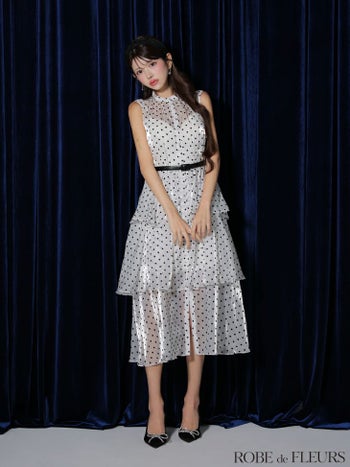 4. 【ROBEdeFLEURS/ローブドフルール】ティアード ガーリー ノースリーブ ベルト付き ドット柄 オーガンジー Aラインロングドレス (fm3281)