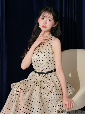 キャバドレス ROBEdeFLEURS ローブドフルー ティアード ガーリー ノースリーブ ベルト付き ドット柄 オーガンジー Aラインロングドレス