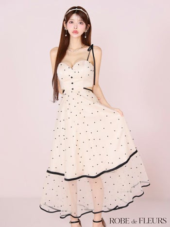 3. 予約商品【4月下旬入荷予定】【ROBEdeFLEURS/ローブドフルール】ドット柄 チュール パール キャミソール ウエストカット ガーリー Aラインロングドレス (fm3298)