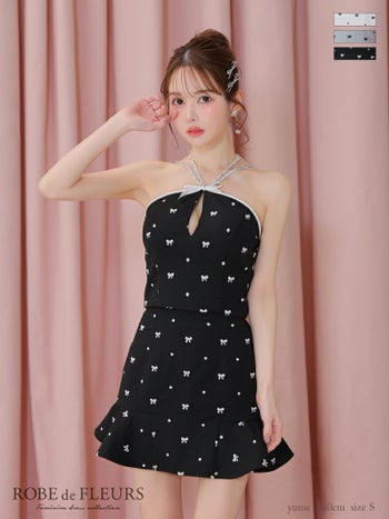 キャバドレス ROBEdeFLEURS ローブドフルール セットアップ ホルターネック バストカット ガーリー リボン柄 ドット柄 フレアミニドレス