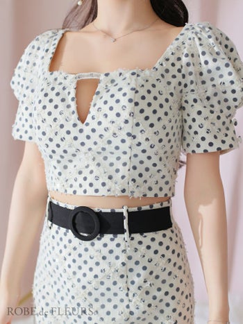 3. SALE【ROBEdeFLEURS/ローブドフルール】ベルトデザイン ドット柄 半袖 パフスリーブ セットアップ タイトミニドレス (fm3703)