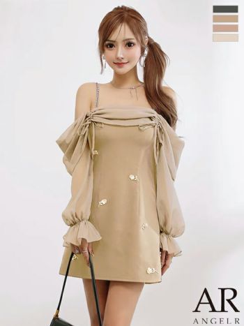 キャバドレス Angel R エンジェルアール フェミニン 2way オフショルダー 肩あき シアー 長袖 リボン フラワービジュー バイカラー フレアミニドレス