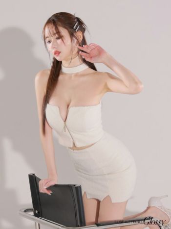 4. 【Glossy by ROBE de FLEURS/グロッシー】チョーカー風 シンプル ジップデザイン ワンカラー セットアップ ニット タイトミニドレス (GL3370)