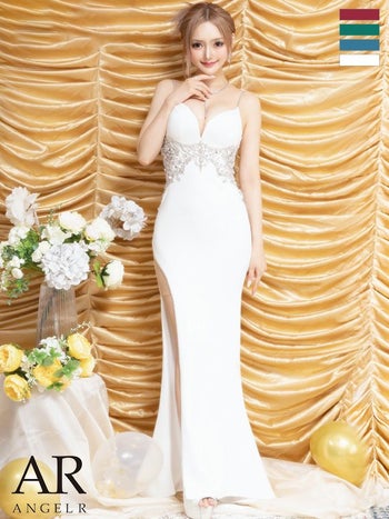 ウエストマーク効果でスタイルアップ魅せ☆ 【Angel R/エンジェルアール】セクシー オープンバスト ウエストビジュー メッシュ スリット キャミソール くびれ透け タイトロングドレス (AR24343)