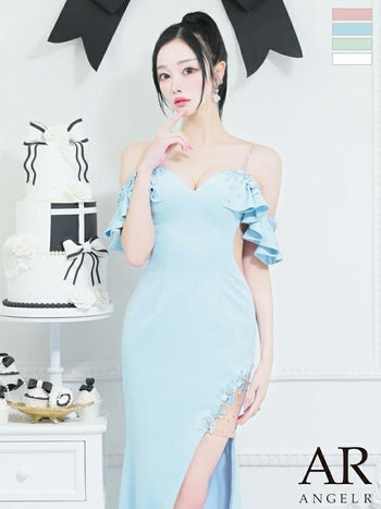 3. 【Angel R/エンジェルアール】Vカット 肩あき セクシー フリル スリット パール フラワー刺繍 くびれ透け タイトロングドレス(AR25806)