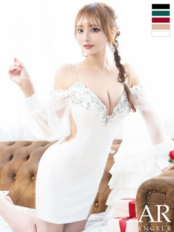 XSあり!ビジュー使いが華やか☆ 【Angel R/エンジェルアール】バルーンスリーブ 肩あき フラワーレース ビジュー オープンバスト くびれ透け セクシー 長袖 タイトミニドレス (AR24838)