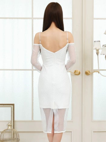 4. 【Veautt/ヴュート】オープンバスト 肩あき 長袖 メッシュ ビジュー スリット セクシー 膝丈ドレス (VT022513)
