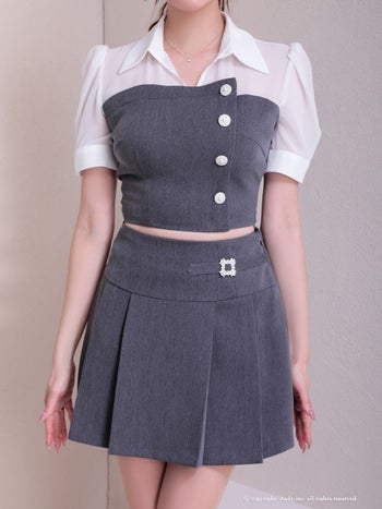 キャバドレス Andy アンディ 半袖 襟付き セットアップ ビジューボタン バイカラー フレアミニドレス