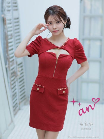 キャバドレス an アン ワンカラー フロントジップ チェーン カットアウト 半袖 タイトミニドレス