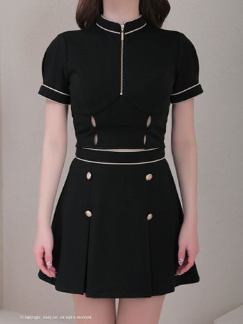 ゴールドボタン セットアップ ジップデザイン バイカラーライン 半袖 タイトミニドレスの全身フロント画像1