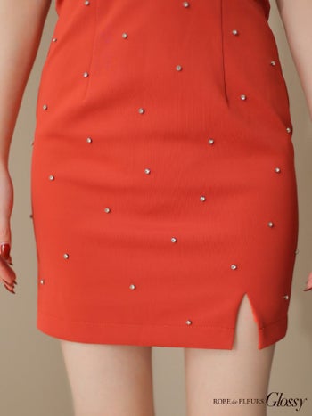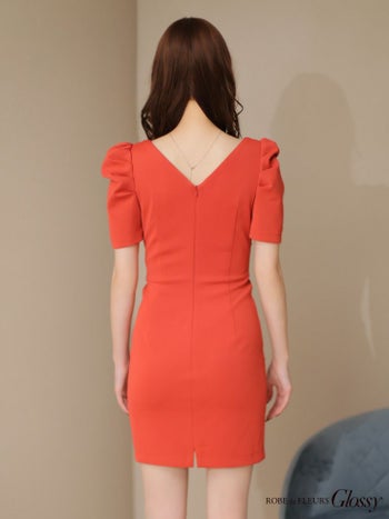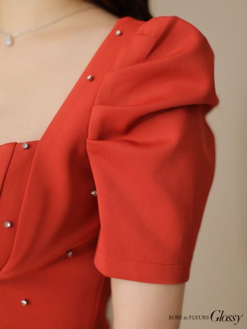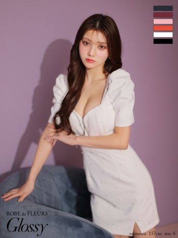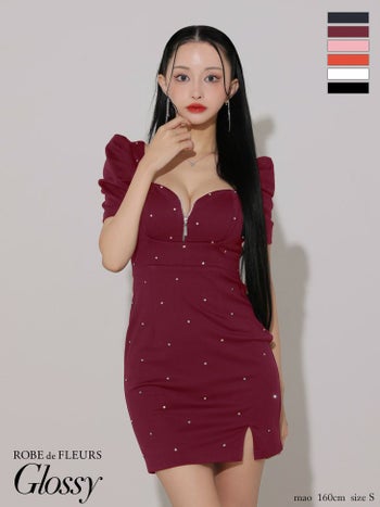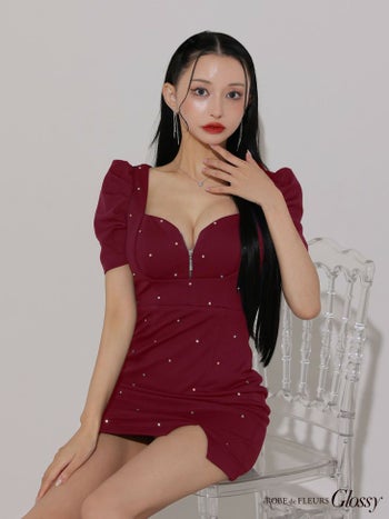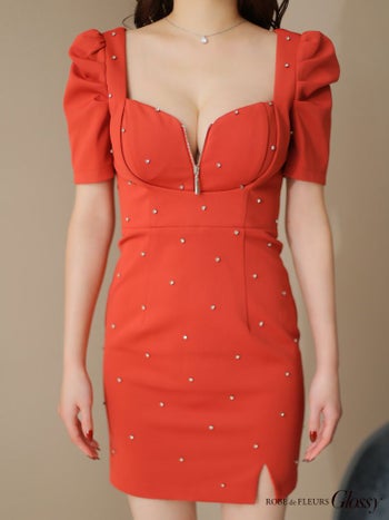 3. 【Glossy by ROBE de FLEURS/グロッシー】半袖 パフスリーブ ジップデザイン オープンバスト スタッズ ビジュー セクシー タイトミニドレス(GL3154)