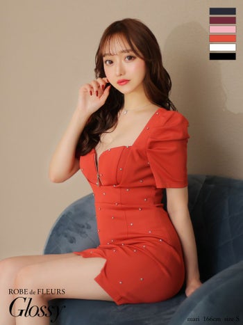 4. 【Glossy by ROBE de FLEURS/グロッシー】半袖 パフスリーブ ジップデザイン オープンバスト スタッズ ビジュー セクシー タイトミニドレス(GL3154)