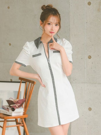 3. 【Glossy by ROBE de FLEURS/グロッシー】襟付き ラメニット 半袖 セクシー パイピング ジップデザイン オープンバスト タイトミニドレス (GL3349)