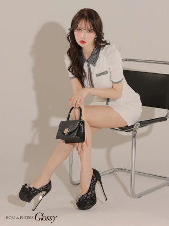 キャバドレス Glossy ROBE de FLEURS グロッシー ローブドフルール 襟付き ラメニット 半袖 セクシー パイピング ジップデザイン オープンバスト タイトミニドレス