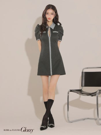 XS~Lあり!シンプルで可愛い一着♪ 【Glossy by ROBE de FLEURS/グロッシー】襟付き ラメニット 半袖 セクシー パイピング ジップデザイン オープンバスト タイトミニドレス (GL3349)