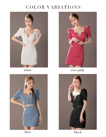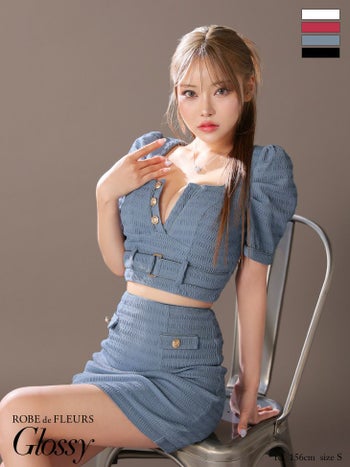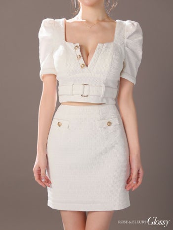 3. 予約商品【2月下旬入荷予定】【Glossy by ROBE de FLEURS/グロッシー】セクシー オープンバスト フロントボタン 半袖 ベルトデザイン ワッフル セットアップ タイトミニドレス (GL3909)