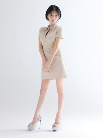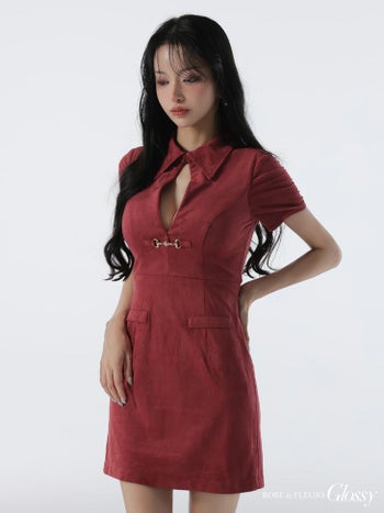 4. 【Glossy by ROBE de FLEURS/グロッシー】セクシー 襟付き バストカット 半袖 スエード タイトミニドレス (GL3945)
