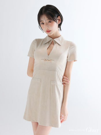 XS~Lあり!上品さとトレンド感を両立☆ 【Glossy by ROBE de FLEURS/グロッシー】セクシー 襟付き バストカット 半袖 スエード タイトミニドレス (GL3945)