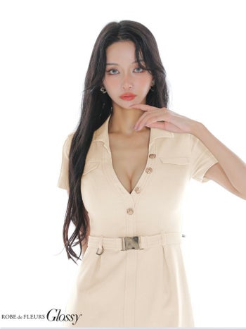 キャバドレス Glossy ROBE de FLEURS グロッシー ローブドフルール 襟付き Vネック バストカット ウエストベルト 半袖 シンプル セクシー タイトミニドレス